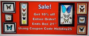 We have some of nature’s most beautiful products. We carry an assortment of REAL butterflies, preserved and artistically framed with wooden frames and glass on both side in order to see the front and back of each butterfly. A great way to bring the outdoors inside!